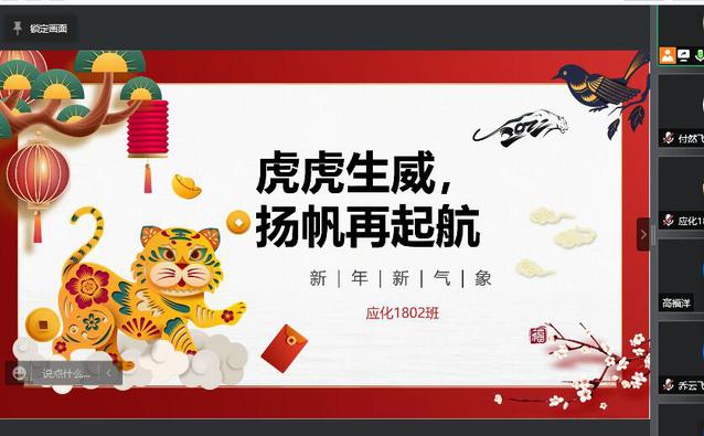 为更好的总结过去,解答同学们关心的毕设、复试、就业等问题,为大学最后阶段做好准备,2月9日,应化1802班举行“虎虎生威,扬帆再起航”线上主题班会。会议由班长国浩主持,联系班级的副院长刘东,班主任杨修洁以及班级全体同学参加。