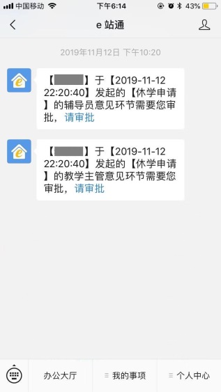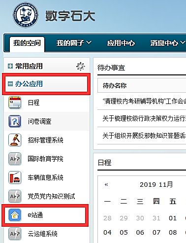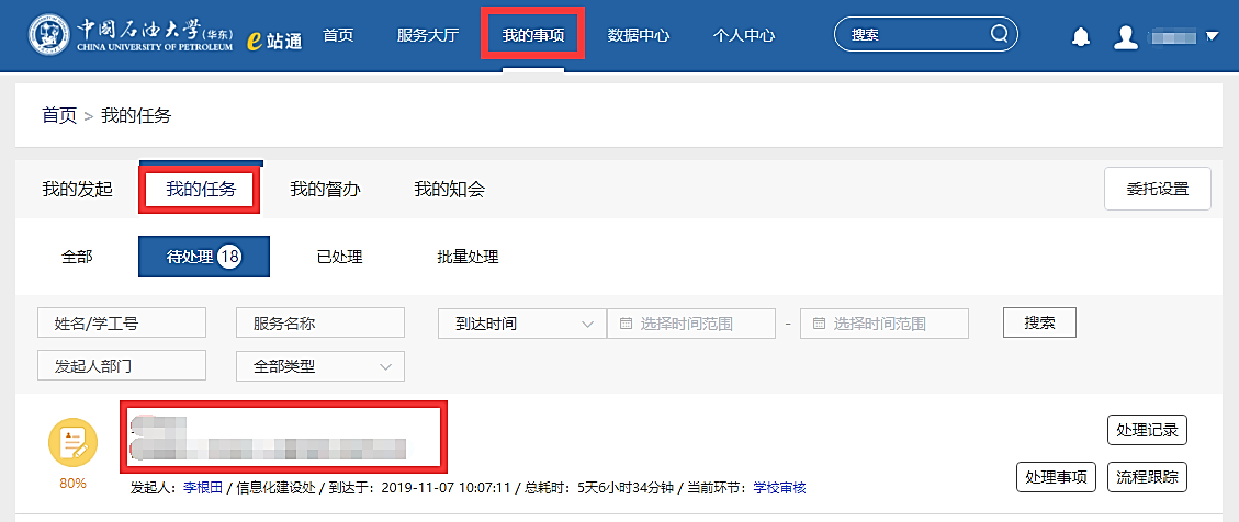 进入学校【数字石大】-【e站通】-【我的事项】-【我的任务】,点击事项进行审批处理。