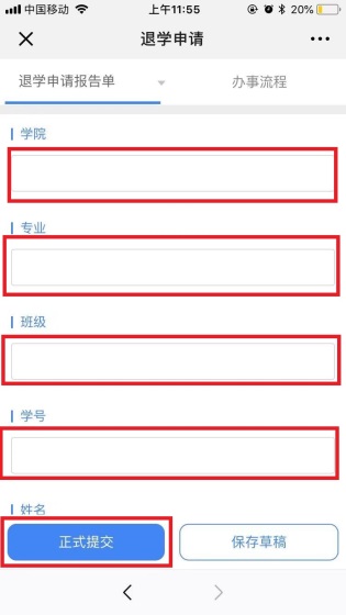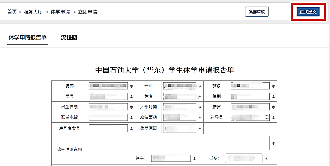 进入学校微信企业号【中国石油大学】-【e站通】-【办公大厅】-【教学服务】,找到相应的退学、休学、保留学籍、复学申请,填写相应的申请报告单并上传相关材料,提交申请。