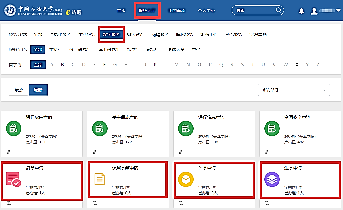 登入【数字石大】-【e站通】-【服务大厅】-【教学服务】,进入相应的退学、休学、保留学籍、复学申请,填写相应的申请报告单并上传相关材料,提交申请。