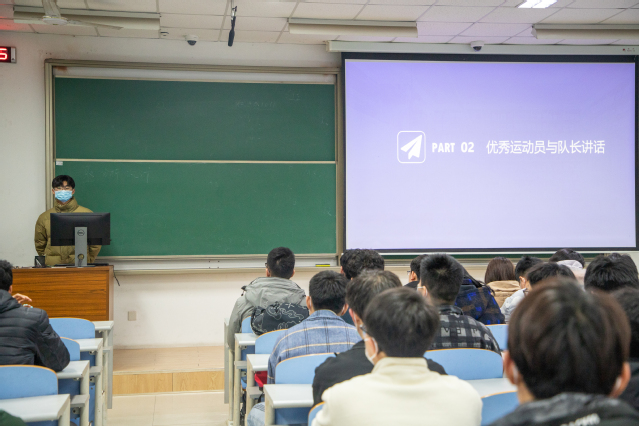 会议伊始,孙浩然向大家介绍此次春训计划并对五月份的运动会表示期待,各队队长结合往年训练经验以及新生冬训情况进行总结。其中短跑队队长唐权分享道:“运动不仅仅让我们有体质上的改变,更让我们在各个方面都有所提升!”。随后进行教练聘任仪式,徐光辉为受聘的4名教练颁发聘书。接着,主管体育工作的辅导员刘伟及2021级辅导员窦雅琴分别进行动员,他们对学院续写运动会六连冠的辉煌充满信心,并承诺会亲自加入到同学们的春训中,与运动员一起并肩作战。动员会最后,徐光辉讲话。他首先对教练员的付出表示感谢,对运动员的努力予以肯定。他从德智体美劳全面发展、拓展社交圈、平衡学习与训练这三个方面进行详细说明,强调学生不应只发展内在,也应拥有健康的体魄,适当的体育锻炼会给学生带来多方面的益处。