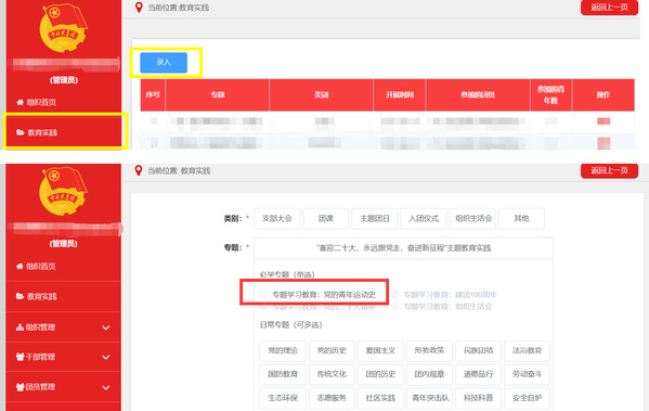 2.活动录入。所有开展团支部均需将本次专题学习录入“智慧团建”系统-教育实践-“党的青年运动史”专题学习教育模块。智慧团建系统录入操作如下:
