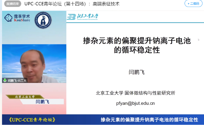 闫鹏飞教授介绍了其课题组利用透射电子显微镜对几种典型掺杂元素演变规律的研究,在此基础上提出了稳定高压正极材料的全新设计理念。张大梁教授主要聚焦敏感晶体材料的离子加工和原子分辨成像,针对电子束敏感材料的表征难题探索出了一套行之有效的弱光拍摄技术,并成功实现技术转化,极大拓展了透射电镜的应用领域。李少锋博士针对电极材料快速充放电过程中的严重比容量损失和使役过程中未知的结构重构,利用原位同步辐射吸收谱学、全场成像和纳米探针技术,揭示了电极材料表面-体相耦合效应的实质,为开发高性能电极材料提供了理论指导。