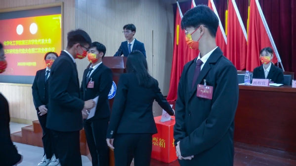 第二次全体会议中,学生代表表决通过大会选举办法、总监票人、监票人名单,总计票人以及记票人名单,宣读了中国石油大学(华东)太阳成集团tyc33455学生会及研究生会主席团候选人名单,进行等额投票选举。