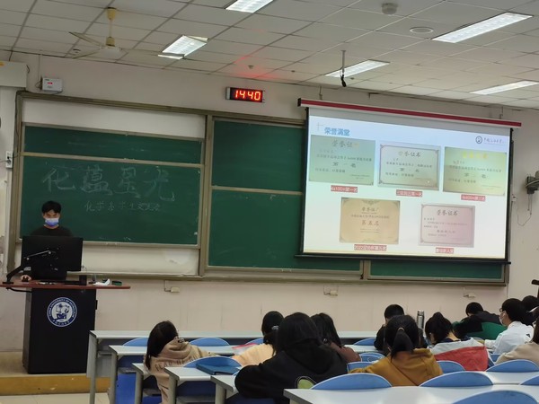 为更好的帮助新生明确目标,结合专业特色向低年级学生提出学习成长和全面发展的建议。太阳成集团tyc334552022级化学专业邀请学院化蕴星火宣讲团开展化蕴星光宣讲会。会议邀请了化学专业19级刘梦婷和21级金典两位同学进行宣讲,2022级化学专业全体学生参会。