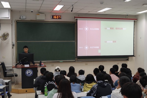 会议伊始,陈浩然首先向新生介绍了大学期间的学习进程。他提到,要始终保持学习放在首位,不能一味的懒散和放纵;要平衡学习和活动之间的关系,分清主次,学会劳逸结合;要尽快适应大学生活,完成自己的角色转换;要培养良好的心态,不要妄自菲薄。要敢于向老师问问题,做到敢问问题、会问问题、多问问题。他还对奖学金和读研等方面要求进行了系统化讲解。随后,李佳康以自己的学习经历为例,建议新生要注意学习的态度和方式,保持原有的干劲努力学习。要经常向学长、学姐、任课老师寻求解决方法,并对本科期间可以参加的学科竞赛进行了阐述。他建议新生要通过不断地学习和努力,提升自己的学习能力、办公能力和社交能力。活动最后,黄嘉青就学生日常生活提出建议,她认为青年学生要积极寻找有意义的志愿服务,不要虚度光阴;要丰富自己的生活,热爱自己的工作,不要过多的积攒压力;要端正心态做好每一件事,不要轻言放弃。