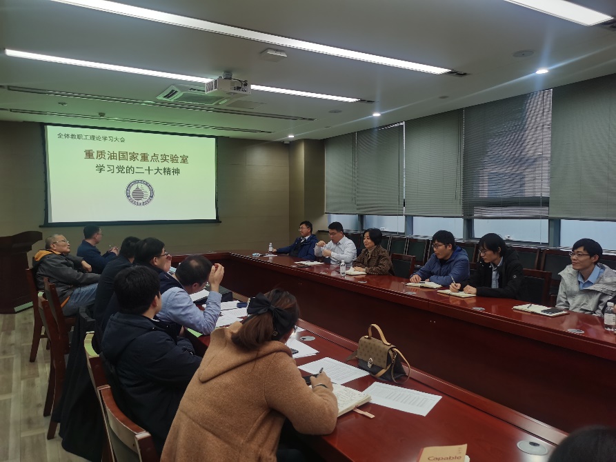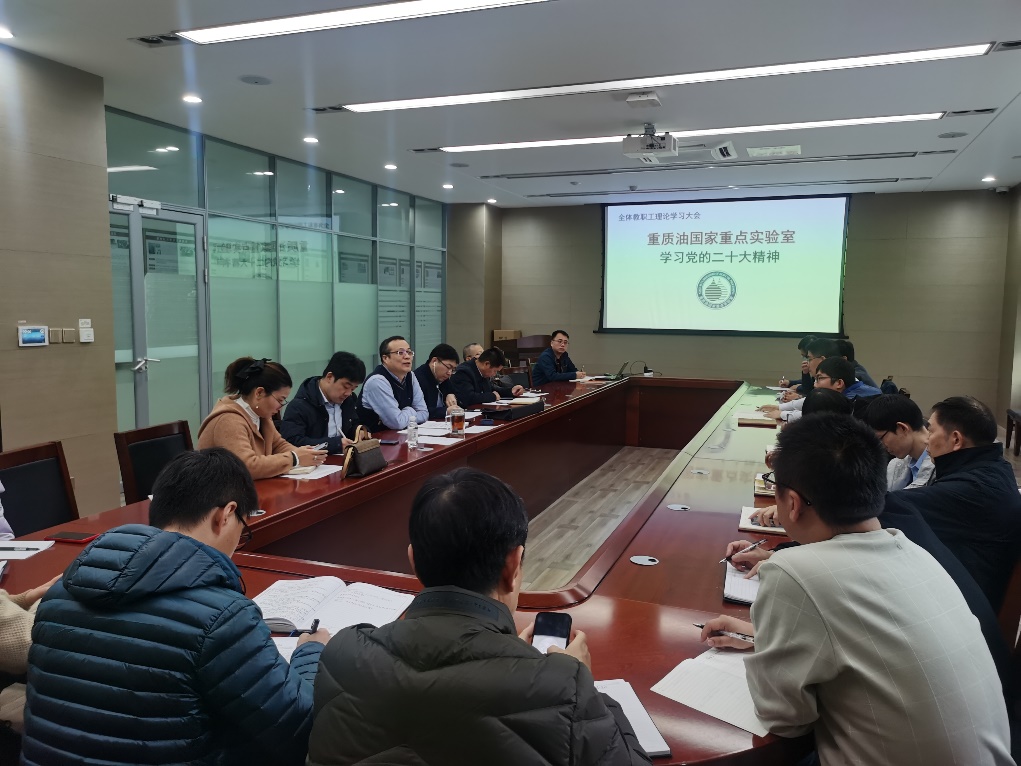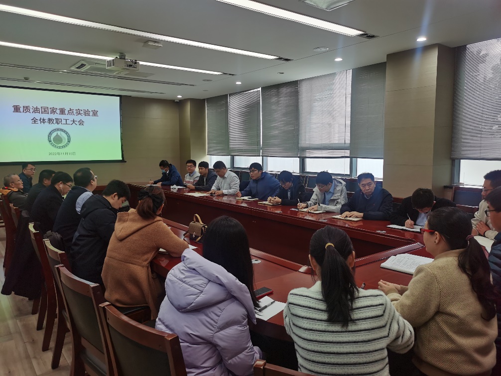 11月15日,重质油国家重点实验室在逸夫楼会议室召开全体教职工大会暨理论学习大会。会议由党支部书记柴永明主持,化学化工学院院长刘欣梅出席会议,重质油国家重点实验室全体教职工参与会议。