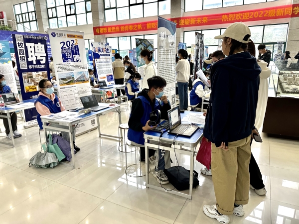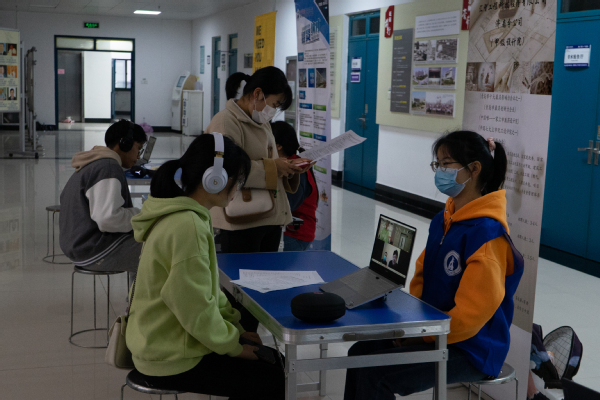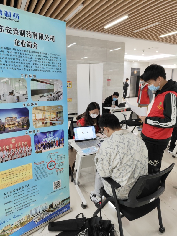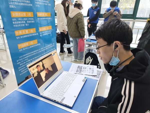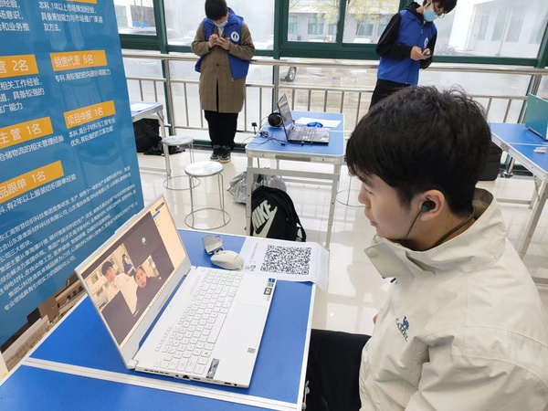 招聘会采取“校园线下+用人单位线上”的模式,志愿者帮助企业在校园内设置展位,学生校内现场通过公用笔记本电脑与企业进行视频连线,了解企业与岗位相关信息,企业对学生的相关问题进行答疑,也可对学生进行现场面试。