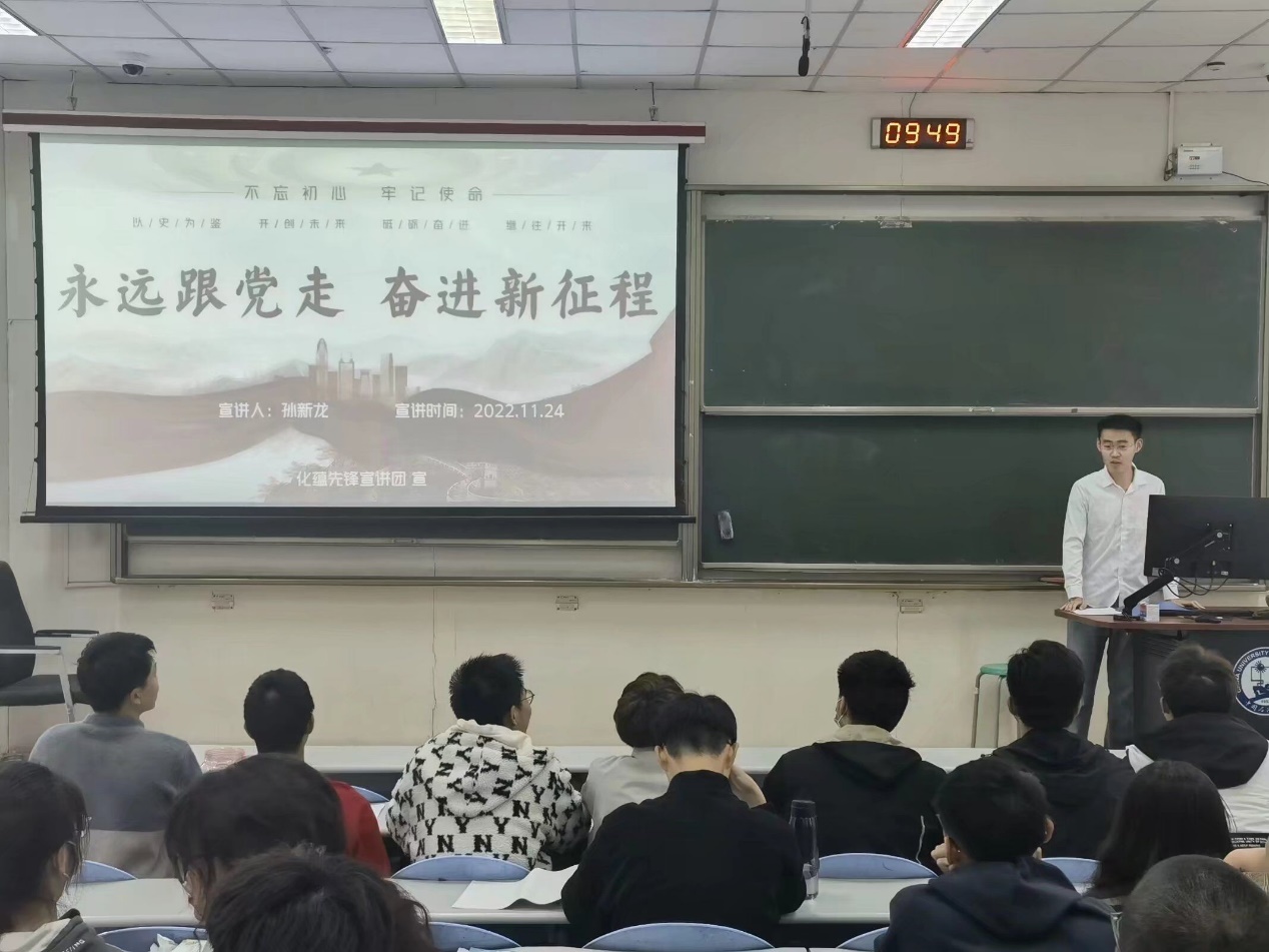 为了深入学习贯彻党的二十大精神,11月24日-11月27日,太阳成集团tyc33455化蕴先锋宣讲团成员孙新龙、王琰皓、覃羽彤、王贺楠深入各个学生支部开展五场理论宣讲活动,推动党的二十大精神理论走深走实、深入人心。