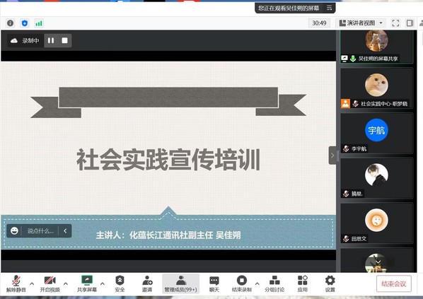 会议伊始,李宇航就本次寒假社会实践实践选题进行指导,鼓励社会实践团队基于国情、社情、民情,从时事热点、时代创新、温度力度深度等多个角度把握实践选题、优化实践内容、打造实践品牌。随后,李宇航向各实践团队队员强调“生命至上、安全第一,在严格遵守各地疫情防控政策的要求下开展社会实践活动”。同时,为深度落实学院学生实践过程中的安全,李宇航坚守安全教育落实到人,安全防范落实到位的理念,重点说明社会实践团队在实践过程中进行每日安全打卡的必要性。接着,传媒中心吴佳朔从稿件撰写、拍摄要求、投稿方式全面而系统向负责宣传的队员讲解,而后依据一篇优秀的新闻宣传范文对段落、字数、文章标题、开头等做了详细的介绍。在宣传培训的最后,吴佳朔展示了化蕴传媒中心编辑部的邮箱,并希望更多团队的社会实践活动通过这个渠道进一步扩大实践活动的影响力。最后,李宇航总结会议,他表示,希望同学们利用寒假实践,努力提高自己参与社会实践的能力,真正在社会实践中得到一些收获。
