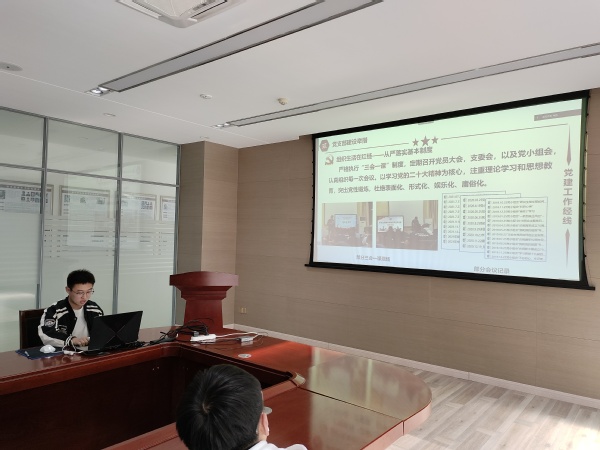 闫明宇从支部概况、建设举措、建设成效和培育经验四方面介绍支部建设经验。闫明宇指出,支部实时双导师制,通过聘请支部思政党建导师与科研学术导师一体化制度,把党建和科研各项工作及各个主体链接起来,实现1+1>2的效果。通过开展“结对子”交流活动,联合党委组织部、党校、机关党委党支部开展主题党日活动,为支部建设创建新思路。