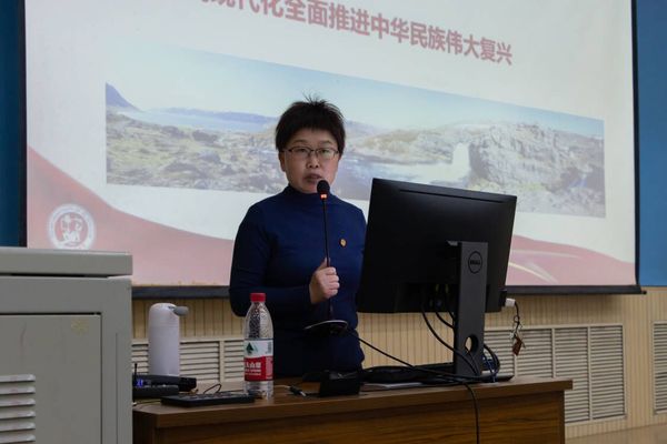 会上,原丽红教授以“迈上新征程,迎接新挑战”为主题,为参会同学系统全面地解读了党的二十大主题,带领广大同学深刻领悟“两个确立”的重大意义,明确了党的二十大召开的意义,宣誓中国共产党对当今中国发展面临的战略环境所作出的新的重大判断。她指出“不谋全局,难谋一域”,提倡广大同学要有大局意识,不要局限于某件事情的局部区域,要审时度势,继往开来!接着,她从新征程、新境界、新状态三个方面解读了二十大的主要内容。带领广大学生学习了中国共产党的中心任务就是团结带领全国各族人民全面建成社会主义现代化强国、实现第二个百年奋斗目标,以中国式现代化全面推进中华民族伟大复兴。最后,她以“时代大风起,狂飙从天落。好风频借力,送我上青云”作结,寄托了她对新时代青年的厚望,时代波谲云诡,新征程的号角已经吹响,广大青年当把握发展机遇,乘风而起,直达青云,做时代的弄潮儿。