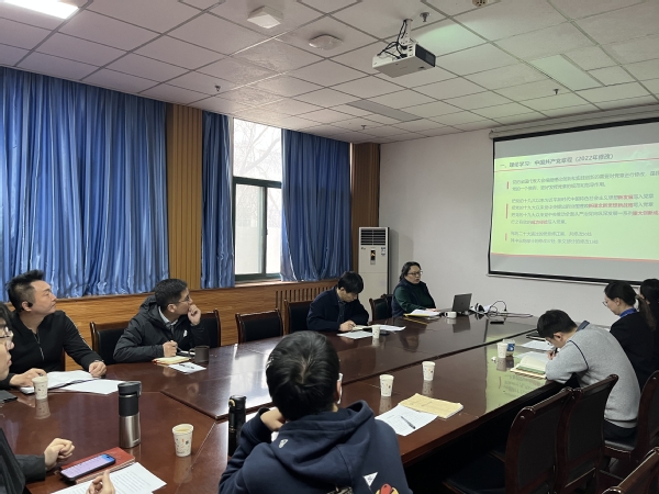 会议伊始,窦雅琴领学党的二十大修改的党章,讲解了党章修改的主要内容,尤其强调要对照新修改的党员义务条文内容,提高自我要求,增强“四个意识”、坚定“四个自信”、做到“两个维护”。组织委员薛慧领学了教育部思想政治工作司2023年工作要点,并结合辅导员工作实际对要点进行了分析解读,号召支部成员结合个人分工优化工作计划,增强育人实效。