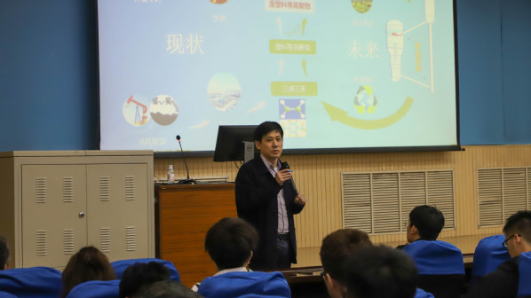 张新功带领同学们回顾了三次工业革命,并与同学们探讨了第四次工业革命的到来的时间以及可能方向。他结合生产生活中的实例,为同学们解释了“碳中和、碳达峰”的概念,并根据惠城环保的重点项目为同学们介绍了能推动实现“碳中和”目标的高聚物的裂解化学循环。他表示用化工方法促成人与环境互不消耗是建设和谐家园的化工使命,希望同学们都能用自己的力量让未来更美好。