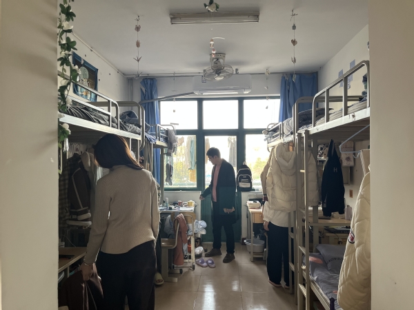 魏孟吉对桌面整洁、室内地面、物品摆放、卫生死角和阳台防火等进行了逐一检查,发现学生宿舍整体情况良好,无私接电源和违规使用电器情况,但存在杂物过多、垃圾未及时处理等情况。魏孟吉要求学生要及时处理生活垃圾,定期开窗通风,并针对有问题宿舍要求现场整改。同时,在走访学生宿舍的过程中,魏孟吉与学生深入交流,询问了解了学生新学期的学习、生活情况。
