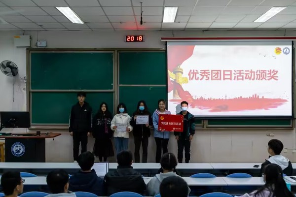 答辩开始后,各团支部代表按照抽签顺序依次上台,通过PPT讲解、视频播放等形式,展示了丰富多彩的团日活动,并分享了活动的心得与体会。本月团日活动中,21级和22级各支部热情高涨。为更好的加深入传承和弘扬雷锋精神,22级五支部联合举办团日活动,充分发挥各支部的优势,加强各支部之前的联系,以“春回大地,奉献人间”为主题开展团日活动。以各支部代表参与雷锋扮演等形式,切实感受雷锋事迹,展现青年力量,同时又将双碳战略与剪纸活动有机结合,宣扬环保意识。应化2102团支部开展“奉献青春,爱使我行”主题团日活动,该支部面向社会发放自制环保手册,积极传播节能减排和维护海洋环境的绿色环保理念。为进一步在实践中体会双碳政策,该支部还开展节能减排分享会,前往青岛西海岸康恒环保能源有限公司进行调研。以上团日活动充分展示了当代大学生的青春与活力。经过激烈的角逐,最终评选出2个优秀团日活动并进行了颁奖。