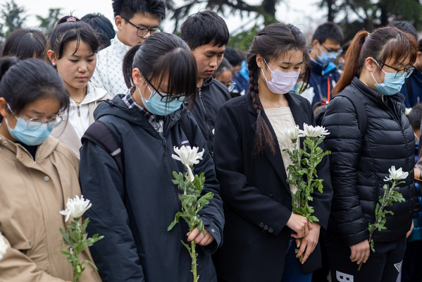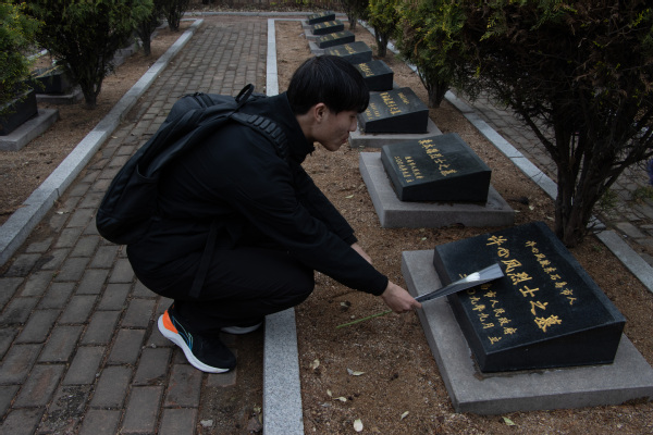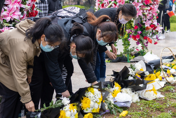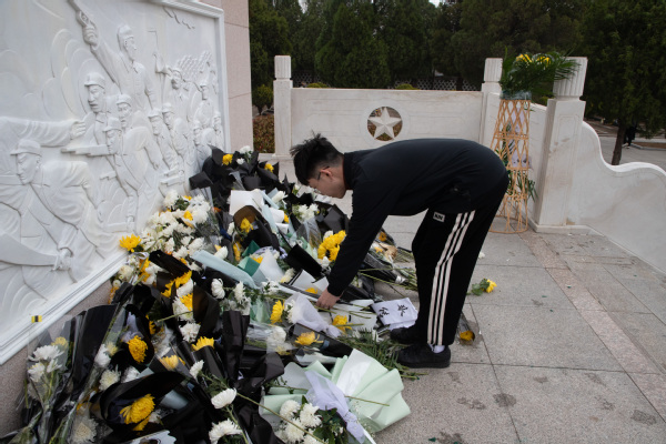 学生会党支部成员为烈士墓碑献花