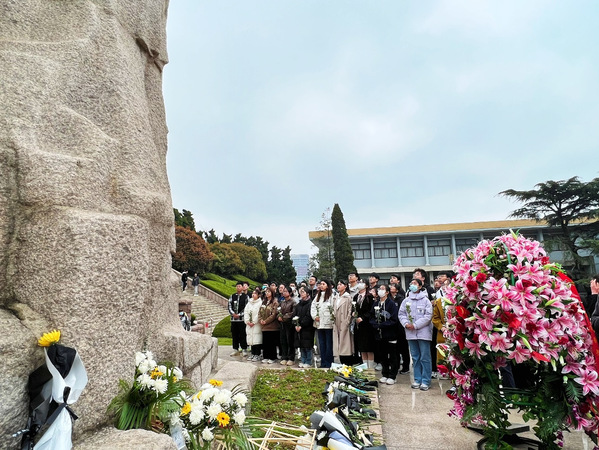 学生会党支部成员在纪念碑前献花