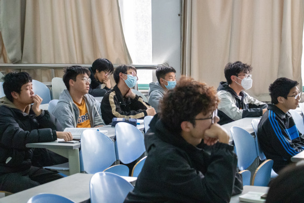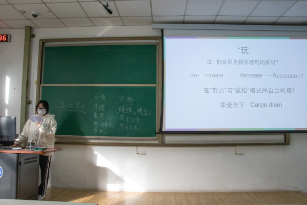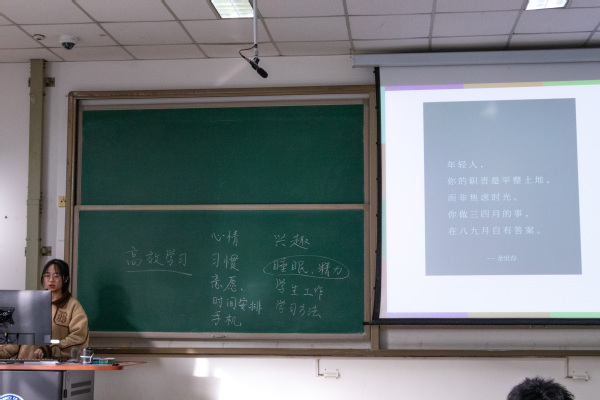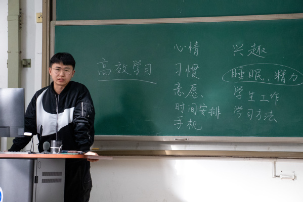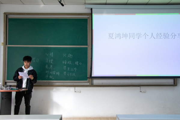 会议伊始,杨修洁给出了“如何高效学习”的建议方法。期间杨修洁与班级学生共同探讨影响高效学习的因素,通过学生回答书写列出存在的疑惑困难。在对于班长磨安正提出的睡眠、精力问题后指出:“要结合自身习惯及学习进度,协调时间安排,以饱满的精神面貌面对课程学习。”以自身的教学经验为学生举出切实案例,通过介绍往届学生在学习中存在的问题,起到了警示作用。随后就平衡学生工作与高效学习方面展开解答,解释说明要平衡好学生工作与学习的关系,期间会议气氛活跃。接着,张星对班级大一上半学年进行了成绩分析,从课堂状态、作息情况、作业完成情况及时间管理四个方面进行反思,介绍下半学年的班级举措,着重强调了“每日英语”的落实,通过帮扶制度带动学生的学习积极性,并邀请夏鸿坤和刘灿然上台分享经验。两人分别就养成学习习惯和劳逸结合展开讲解,刘灿然提到:“我们要在努力和放松模式间自由转换,享受当下。”否定了刻板学习,强调全面发展。最后,国浩进行了总结,他要求全班明确了下半学期班级的发展方向及目标,鼓励学生一同进步,加强学风建设,保持优秀班集体的节奏。