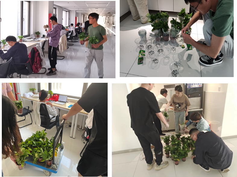 为进一步贯彻落实“我为师生办实事”,参会人员从国重楼402搬25把椅子到国重楼二楼走廊,供同学学习使用。支部为研究生购买了100盆绿萝,分别布置到2-5层走廊工位的桌上,为实验室增添了一抹绿色,绿植既可以清华空气,同时也可以陶冶同学们的情操。