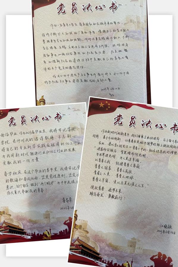 封封决心书,代代化院人。毕业生书写出征决心书是学院自1954年首届毕业生向党提交决心书以来代代传承的优良传统。仪式上,在《去西部》《不忘初心》的音乐声中,青年党员提笔静思,在决心书上郑重写下对党和祖国以及母校母院的承诺,嘉宾老师们也为2023届毕业生写下青春寄语。