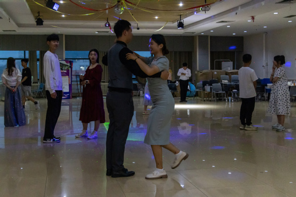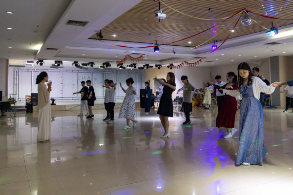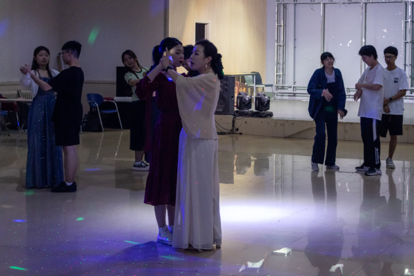 在第一篇章伊始,周静通过动作演示,具体地向学生介绍华尔兹的基本动作,指出起舞时的神态与气质。接着,她就四方步、前进方步及后退方步,对参加成员进行实践教学,在一次次练习中让大家逐渐熟练掌握舞步。之后将人员以男女各一划分为数十组合,旨在通过不断磨合协调,实现步调统一。在互相练习中,现场学生们相互配合,舞出华丽的舞步。随后,活动进入到第二篇章在自由训练过程中,周静下场根据各组合的动作开合、面部表情、走位规范做出针对性指导。她提到,华尔兹是生命力非常强的舞蹈形式,要结合身体的升降、倾斜、摆荡,带动舞步移动,使舞步起伏连绵,舞姿华丽典雅。之后,音乐声起,各个组合一齐舞蹈,步伐一致。极大的表现出了舞蹈的自信和表演的享受。在舞蹈过程中,他们打破原有的组合,现场随机组合将舞会的氛围推向高潮,在优雅曼妙的舞姿中展现出了属于学生们特有的精神面貌与昂扬自信。最后,在最后一曲中随着舞曲结束,本次活动也拉下了帷幕。