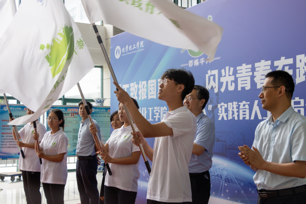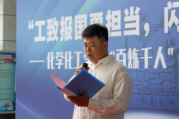 活动伊始,张永宁对“百 炼 千 人”实践育人工程展开深入介绍,并就此次“工致报国勇担当,闪光青春在路上”——“百 炼 千 人”实践育人工程进行仔细解读。他指出,社会实践并非一次简单的旅行或游览,而是需要学生切实深入到企业中去,真学真看真听做真学问。接着,带队教师代表王兆兴对实践育人工程的流程给予简单描述,计划将从收集整理企业基本情况、对企业发展现状调研、访谈杰出校友、前往红色基地学习等多方面入手。旨在提升学生的环保意识和专业素养,励志行业报国,争做绿色转型的先锋者。接着,学院实践中心学生代表周天润说:“绿色转型和双碳战略成为了当前的热点话题,这对于化工行业来说,是一项重要的挑战和机遇。我们将以专业的态度和创新的思维,积极投入到本次实践工作中,为化工企业的绿色转型和双碳战略的实施贡献自己的智慧和力量。”之后,学院领导与专业教师共同为“百 炼 千 人”实践育人工程项目洒金。刘欣梅、张永宁、刘义、徐光辉分别为四个实践队代表授旗。同时预祝此次“百 炼 千 人”实践育人工程圆满成功。