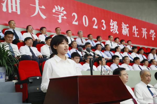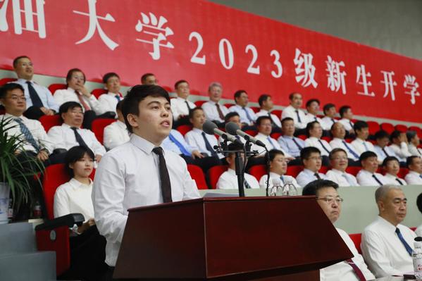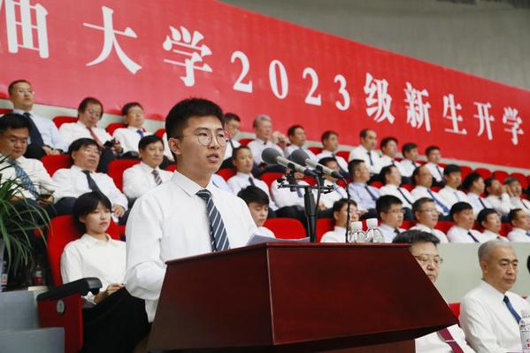 石油工程学院2023级硕士研究生张洲源代表研究生新生发言,表示要扎扎实实练好内功,坐住“冷板凳”,让最初的热爱在石大这片广阔天地中绽放青春光彩。