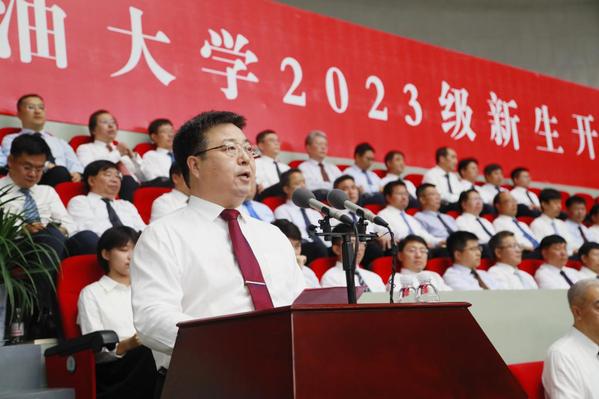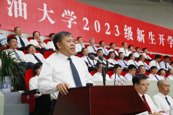郝芳结合学校的艰辛历程、卓越贡献向新生介绍学校情况。他指出,石大是一所秉承家国情怀、做出不可替代贡献的大学:作为新中国第一所石油高等学府,石大整建制地援建了多所石油高校,不断探索工科大学发展之路,为中国高等教育特别是石油高等教育的发展做出了不可替代的贡献;建校70年来,学校培养了30多万优秀学子,师生校友参加了新中国几乎所有大型油气田的勘探开发,参加了几乎所有大型化工厂的建设和运行,为中国石油工业从无到有、从弱到强做出了不可替代的贡献。石大是一所历经艰辛、追求卓越但仍在创业的大学:学校先后在北京荒滩、东营盐碱滩、黄岛泥滩上建校,现又在建设古镇口校区,届时学校将成为学生学习和生活条件最好的大学之一;学校始终以服务国家战略和经济社会发展为己任,以“双一流”建设为契机,强化石油石化等优势学科,拓展新能源、新材料、海洋、信息等学科,提升通用基础、人文社科学科,超前构建了符合学校特色优势、适应科技发展趋势、满足经济社会发展需求的学科专业体系;学校正在全面构建和完善新时代人才培养体系、新时代科技创新与科技服务体系、现代大学治理体系,将以卓越的师资、卓越的学术、卓越的文化和卓越的服务,为同学们开启卓越的人生保驾护航。