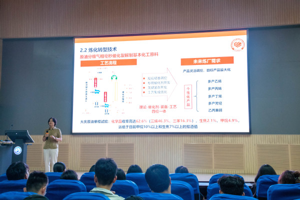 第一部分,院长刘欣梅做主题报告。刘欣梅带领学生重温了学院70年发展历程,介绍学院专业、学位点和研究平台建设情况。围绕炼化转型、高端化学品、新能源、新材料等11个方面,刘欣梅介绍了学院近年来的科研成果及转化情况,鼓励同学们关注社会发展和行业建设进展,将专业知识转化为学科素养,积极投入专业学习实践和科研创新活动,“将论文写在祖国大地上”。