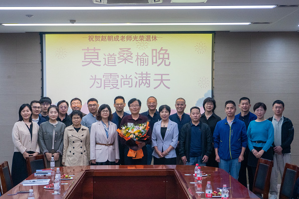 赵朝成教授分享了自己的退休感受,他深情回顾了在学校与各位老师并肩作战的时光,感谢各位前来参会的老师给予自己的肯定和关怀。他表示,自己即便已经退休,但仍会以积极饱满的态度关心青年教师的成长,关注学科发展,继续发挥余热。最后,闫来洪老师代表全体教师为赵朝成老师献上花束,大家合影留念,为赵朝成老师送上最真挚的祝福。