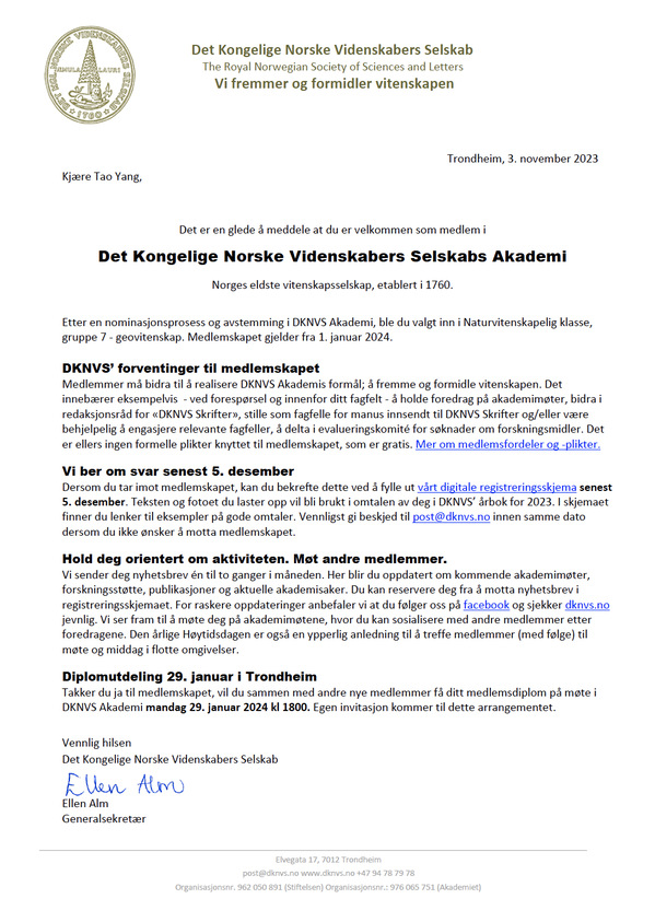近日,我院应用化学1987级校友杨涛当选挪威皇家科学与文学院(The Royal Norwegian Society of Sciences and Letters )院士。