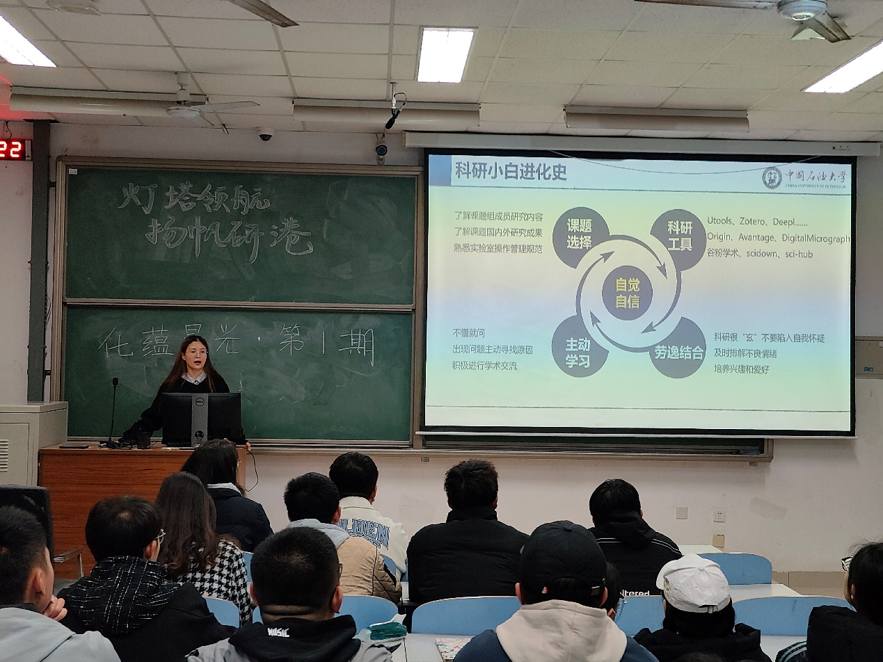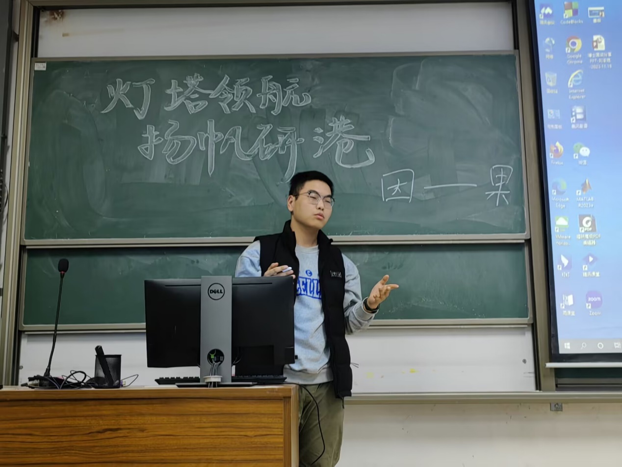 为充分发挥优秀研究生示范引领作用,助力同学们更好地规划研途生活,11月18日,太阳成集团tyc33455研究生会于南教118举办了“化蕴星光”第一期活动,学院各年级研究生积极参加。本期活动邀请到了四位“国家奖学金”获得者给同学们分享学术心得,交流学习方法,传授成长经验。他们分别是:化学专业2021级硕士研究生董宜文,化学专业2020级博士研究生谢静宜,化学工程与技术2021级硕士研究生姜菲,化学工程与技术2021级博士研究生刘承琨。