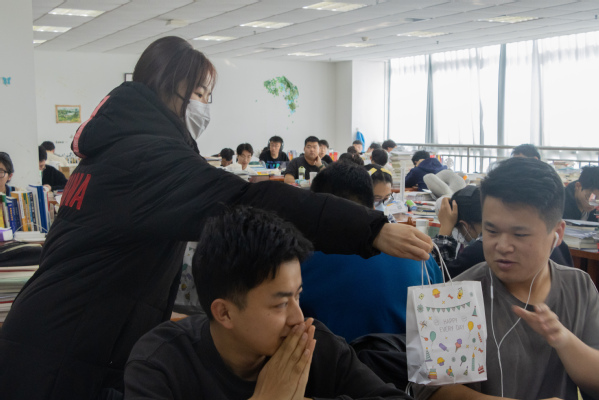 在慰问活动中,辅导员栾琳、王兆兴与考研学子进行了亲切交流。他们叮嘱同学们要在复习阶段保持良好的学习状态,按照既定的安排合理备考,不骄不躁,持续发力,坚持到最后,不留遗憾。同时,他们也强调了劳逸结合的重要性,呼吁同学们不必刻意加码,保持身心健康,以最好的状态备战考研。此外,辅导员们还鼓励同学们要相互扶持,相互鼓励,遇到困难及时与老师交流沟通。他们表示,学院将会尽全力帮助考研学子解决困难和满足需求。随后,两位辅导员及各班班长代表学院将精心准备的考研加油包发放到每一位考研学子的手中。这些暖心的礼品让在场学子倍感温暖,深受鼓舞。其中一位考研学子表示:“我们即将迎来人生路上的重大考试,学校给我们传递的温暖,我们都深深感受到了。我们一定会坚定信心、全力以赴,不辜负学校的期望。”慰问活动结束后,辅导员及各位代表悄悄离开,研读区重归安静。