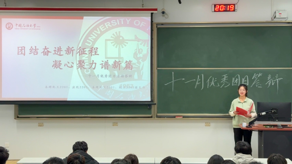 活动伊始,詹宇程介绍了本次团日活动答辩流程及评选规则。随后,各团支部代表依次上台,以PPT讲解,视频播放,图片剪影等形式进行成果展示。在本月活动中,各支部遵循月度活动指导意见,深入贯彻习近平新时代中国特色社会主义思想,对团日活动形式进行创新拓展。其中,化工2306团支部通过以“关注消防安全,共建和谐社区”为主题的志愿服务活动,前往珠江路小学进行消防知识宣讲。本研化工2201、应化2203团支部联合灵山岛升级自然保护区兴港路社区,走进积米崖小学,共同举办“锻炼出风采,运动强体魄”趣味运动会。以上团日活动充分展现了各团支部成员的青春活力。