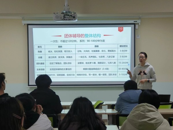 紧接着,由薛慧进行如何带领班级开展团体辅导的专业培训。薛慧从团体辅导的优势、基本流程、设计方案及注意事项等方面进行了系统的讲解。她讲到,团体辅导的整体结构共分为五个单元,每个单元都有其各自的目的、活动内容和活动建议建议时长。在讲解的过程中,针对每个部分的目的,薛慧都用通俗的话语进行了深入浅出的讲解,并且带领心理委员进行现场演练,模拟团辅活动的现场,事无巨细,让同学们身临其境,感受每个活动的意义,以言传身教的方式教会大家如何开展团辅活动。同时在实践过程中,针对预设的各种突发情况,并针对性地给出解决方案和注意事项。