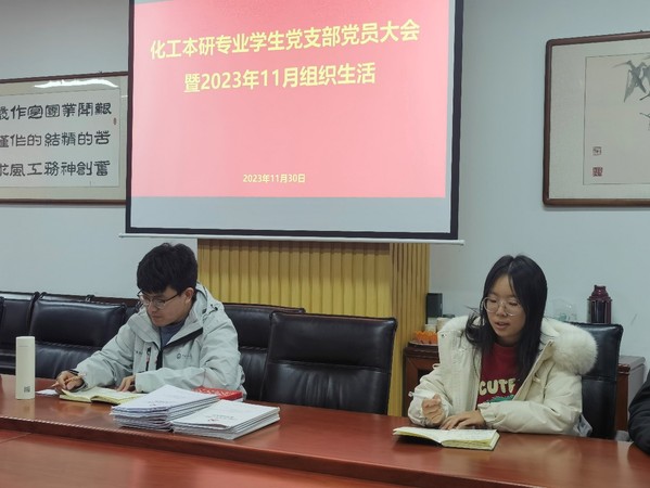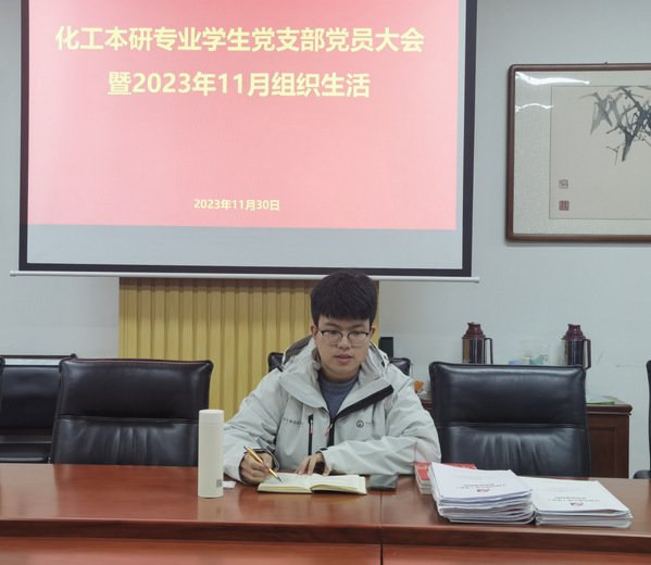 2023年11月30日晚,化工本研专业学生党支部于工科实验楼A座121会议室召开党员大会,讨论接收新发展党员并组织集中学习。本次大会由支部书记赵成义主持,支部全体党员出席本次会议。