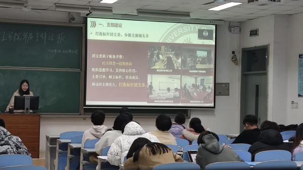 工作汇报环节,2021级各支部团支书依次对2022年12月至2023年12月期间团支部开展的相关工作内容进行汇报,工作内容涵盖三会两制一课开展、支部特色发展情况、二课开展相关活动、支部内学风建设以及支部未来发展规划等。本次汇报全方位、多层次、宽领域地呈现出各团支部生机勃勃、活力四射、朝气昂扬的风貌。