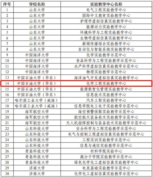 近日,省教育厅官网关于山东省普通高等学校实验教学示范中心名单公示期结束,我院化学工程实验教学中心入选“山东省普通高等学校实验教学示范中心”。