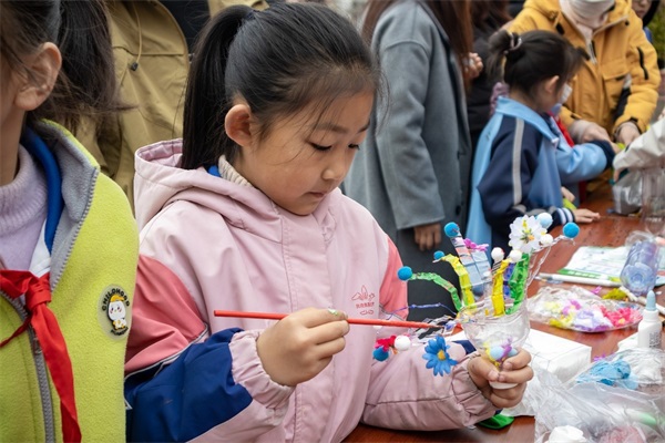 在旧物传爱环节,小朋友及其家长捐出旧书、塑料瓶、衣服等物品,在本环节收集到的许多旧物中,支部成员选取其中部分物品进行“化”废为宝环节。通过手工DIY的形式,带领小朋友及家长一同动手实践,体验旧衣变抱枕,废纸变新纸、塑料瓶变小玩具的过程,变废为宝,化旧为新,赋予废品新的生命。与此同时,支部成员还举办了知识竞答和垃圾分类实践环节,让居民尝试将不同类型的垃圾投入相应垃圾桶进行分类,加深居民对垃圾分类的认识,让广大居民进一步了解了低碳生活方式,也促进居民养成垃圾分类的习惯。活动中,四支部成员结合专业特色,融合国家双碳战略和环境保护理念,将化学知识融入到各个环节之中,向小朋友们展现化学的魅力。