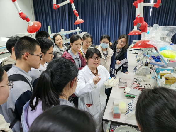 一进入教学实验室,学生们就非常激动,眼中散发出对知识的渴求。三位老师首先带领学生们认识了生物学实验相关的重要的大型仪器,如高压灭菌锅、超净工作台、紫外分光光度计、高通量检测酶标仪等,通过观察实验,学生们对课堂上讲述的理论知识有了实践性质的深入了解,并领悟到科学的发展离不开仪器的发展,而仪器对科学的推动不局限在其发明的原始目的,科学理应学以致用。