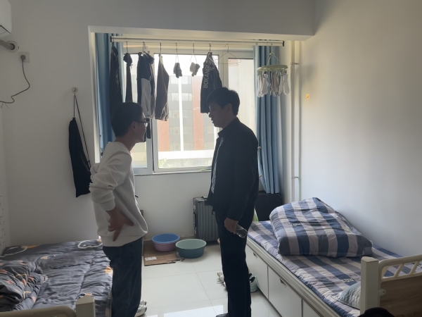 徐光辉一行重点检查了宿舍楼内电线电路、违规电器以及安全隐患等等。检查过程中,他与学生亲切交谈,询问了学生们的生活和科研情况,并对宿舍内安全卫生问题提出具体要求和指导意见。此次检查发现,大部分宿舍的安全卫生状况良好,但仍有部分宿舍存在地面脏乱、杂物堆积等问题。针对这些问题,学院古镇口研究生工作组要求相关同学立即整改,当天对问题宿舍进行了“回访”,整体改进良好。最后,徐光辉还走访了实验室,与实验室内学生进行了交流。