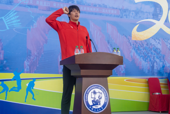 学校党委书记王勇宣布2024年运动会开幕,学校党委副书记万云波主持开幕式,学校党委副书记、纪委书记、体育运动委员会主任吴强明致开幕辞,裁判员代表、体育教学部刘高强和运动员代表、储建学院张嘉怡分别宣誓。