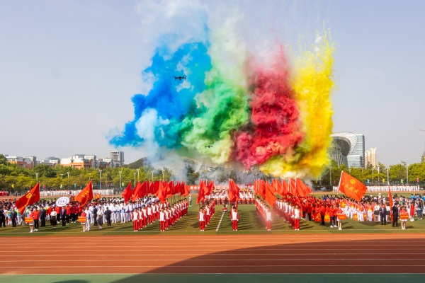 运动场上摩拳擦掌,观众席里掌声雷动。团体操威风锣鼓、太极扇、啦啦操和教工排舞依次上演,引起全场观众欢呼。威风锣鼓整齐划一,鼓声震耳欲聋,尽显豪气壮志;舞动的神龙引领着太极扇方队的入场,白衣簇拥着盘龙,潇洒展扇,最后排出的“龙”字体现着传统文化在我校活力不断;随后入场的啦啦操排出各个重要的时间节点,金色的数字映照阳光,尽情释放着青春活力;最后红旗簇拥着教职工舞蹈,吉祥物们穿过操场领舞,红色的丝带伴随歌声体现着职工们一心向党的赤诚之心。