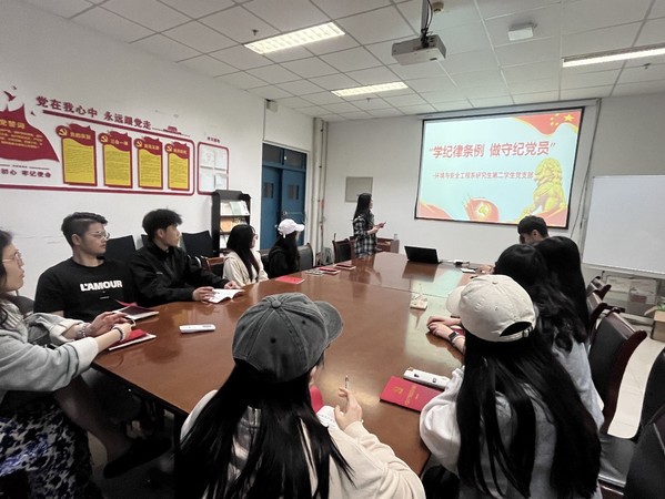为深入学习贯彻习近平总书记关于加强党的纪律教育的重要论述,进一步增强党支部全体党员纪律意识,推动党纪学习教育入脑入心走深走实,环境与安全工程系研究生第二学生党支部于5月23日开展“学党纪条例,做守纪党员”组织生活。