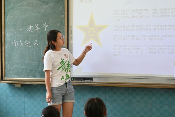 在支教期间恰逢八一建军节,为了培养同学们对于军人们的尊敬之情和对于国家的自豪之感,支教队员们开展了相关特色建军节课程。通过对我国强军现状、我国军队历史、当今国际形势多方面的介绍,让同学们了解到了部分军旅知识,同时加强了对于国家军队的自信。课堂最后支教队员们为同学们播放爱国歌曲并带领同学们一起歌唱《强军战歌》,用铿锵有力的歌声表达对于祖国八一建军节的祝福。