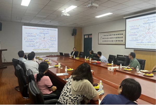 侯召民研究员首先介绍了日本理化学研究所的发展历程以及赴日本留学的研究经历和所开展的研究工作。随后从“自愈合”功能材料出发,侯召民研究员利用半夹心稀土催化剂首次实现乙烯和极性α-烯烃的高度可控共聚,制备了一系列结构新颖、性能独特的功能化聚烯烃及共聚物。特别是利用乙烯与一种或多种苯甲醚基丙烯的高效共聚,成功合成了高分子量、乙烯-取代丙烯交替为主同时含有少量短链聚乙烯的多嵌段共聚物的研究进展。这种序列调控的共聚物具有柔性的乙烯-取代丙烯相和相对较硬的乙烯-乙烯半结晶纳米微相,展现了独特的弹性体和自愈合能力,引起了在座师生的极大兴趣。随后,侯召民研究员回归稀土化合物的发展史,讲述了针对不同取代基、构象和构型的烯烃,开发不同的稀土金属络合物催化剂,以达到制备具有不同性能聚合物的目的。最后,侯召民研究员介绍了稀土金属络合物在催化C-H键活化官能团化等方面的研究工作,分享了关于稀土催化剂的设计理念与思路,充分体现了稀土催化剂的独特魅力以及在催化、反应以及材料方面的巨大潜力。在交流提问环节,现场师生积极互动、踊跃提问,侯召民研究员对“新材料的发展趋势”、“稀土催化剂的结构设计”以及“聚合物材料的回收以及如何看待塑料裂解这一研究方向”等问题给予了一一细致解答。