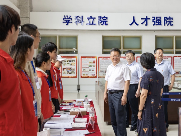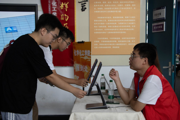 在学院大厅,“光辉的历程”文化墙及优秀校友展,让新生迅速了解学院的历史和发展;“优秀学生集体及个人风采展”“研究生学术成果展”等迎新展板,让新生充分感受学院学生科技创新氛围;“缤纷化蕴”主题展,通过领航化院、拼搏化院、多彩化院、力行化院、科创化院、腾飞化院、奋进化院、学术化院向新生展示了多彩的大学生活。穿过挂有“畅想缤纷化蕴”“共享青春‘化’章”的标语和“请党放心强国有我”的立柱,新生分年级、专业进入迎新报到点,办理入学相关手续。