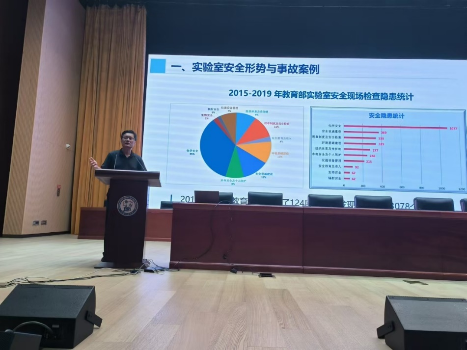为了增强学生的安全意识,尤其是提高对实验室安全的认识水平,确保安全规范意识落实到每个人,学院于9月10号下午在古镇口校区综合楼大礼堂召开安全教育培训大会,学院全体博士生和硕士生参加,学校实验室管理处成宏涛副处长、学院徐光辉副书记、安全监管办公室戴永胜、国重室朱丽君以及各课题组负责安全的老师和科研助理参加培训会,陈小博副院长主持会议。