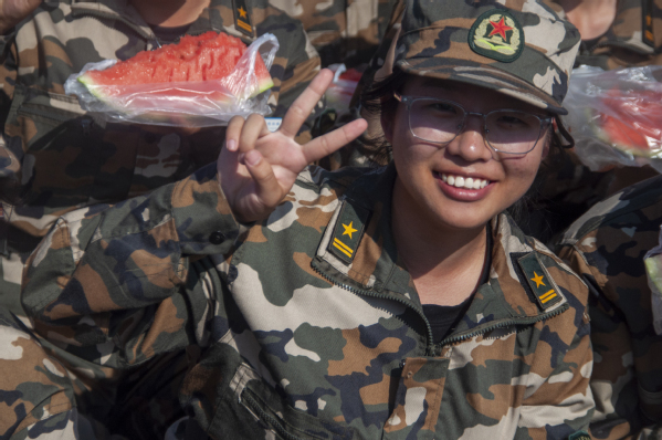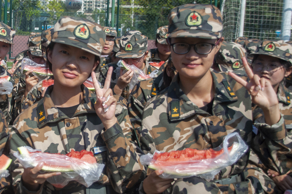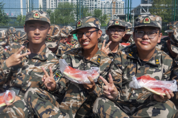 刘欣梅、张永宁一行为参训师生送来了西瓜解暑,并详细了解了军训的人员、内容、进度、保障等情况,他们对教官和带队教师的辛勤付出表示感谢,对参训学生的训练成果和精神状态给予肯定,希望师生圆满完成军训任务,充分展现化院人的风采。